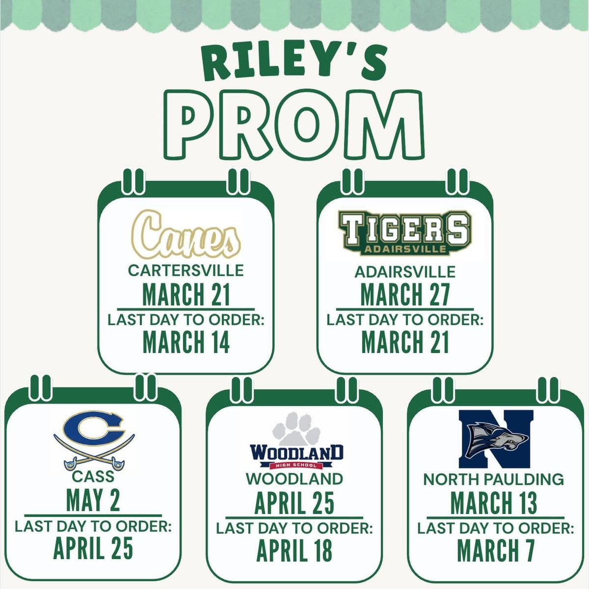 Riley’s serves ALL schools. Listed dates are for nearby schools only.